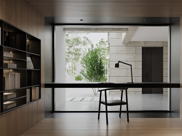 客廳的設計以高級灰作為主要元素,充分的利用戶型和室外的光影結合,運用下沉式的設計手法,結合園林屏風的元素構建,營造出一處宜賞宜居的會客公共空間